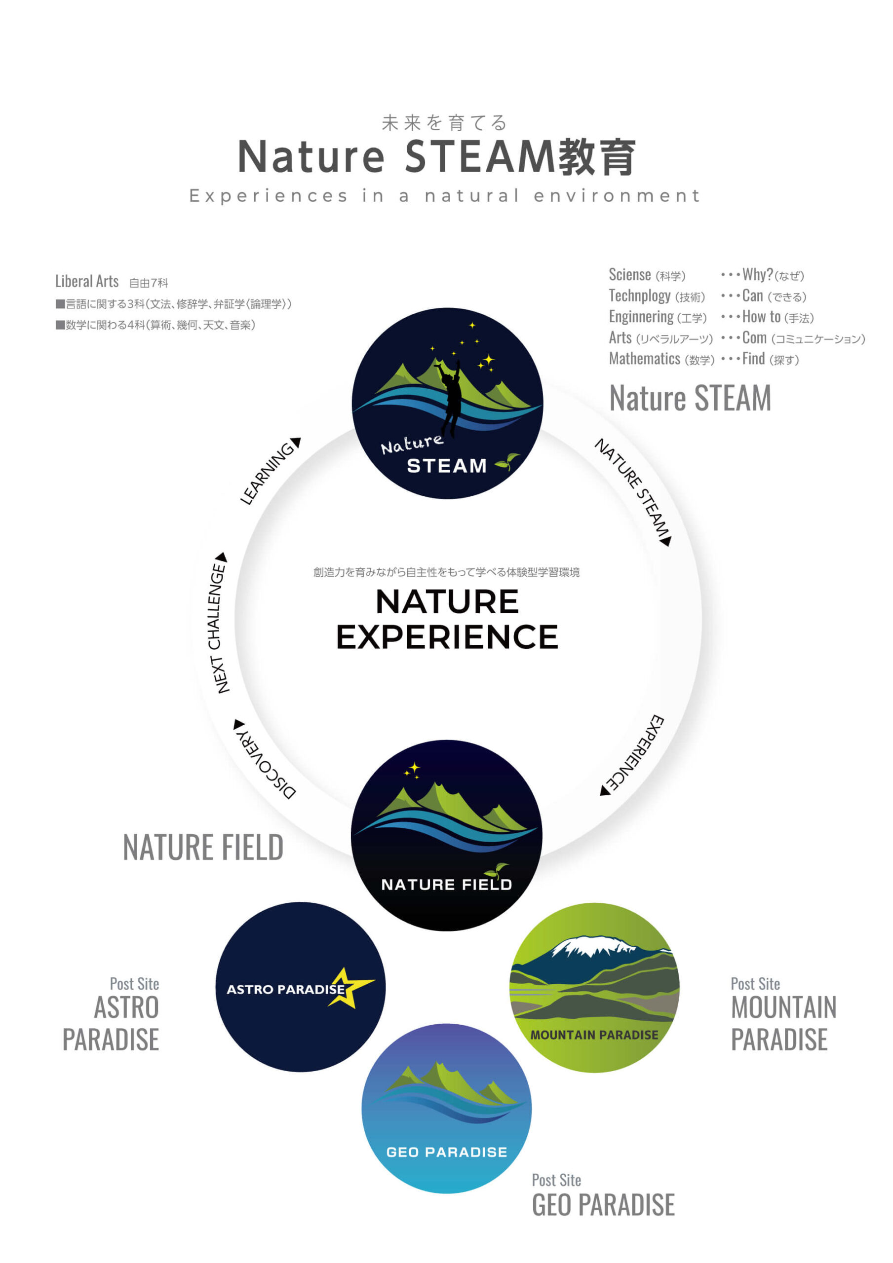 NATURE FIELDとNature STEAM教育の関連性 真の学習には知識と経験の両方が必要です。 知識と経験が車の両輪に例えられるように学問を学ぶうえではどちらが欠けても不十分です。 また、自然科学とテクノロジーも同様の関係性をもっています。 テクノロジーが今に至るまで発展してきた大きな理由は自然科学つまり、地球をとりまく宇宙空間における様々な自然に対する研究を積み重ねてきたからです。今後のテクノロジー開発にとっても自然を知るということが必要不可欠なのです。 将来、様々な問題に取り組み解決できる力のある人に育てることを目的としたSTEAM教育にとって、自然学習は切り離すことのできないとても重要な分野です。 Nature STEAM(ネイチャースチーム)https://nature-steam.com ※当サイト内の文章・画像等の内容の無断転載及び複製・転用を固く禁じます。(著作権法)